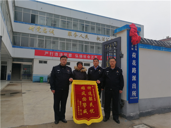 2月27日上午,一名群眾將寫著“神速解民憂 雄風(fēng)揚(yáng)警威”錦旗送到川匯公安分局荷花路派出所民警手中,感謝民警們的辛苦付出。錦旗背后的故事還得從一條抖音說起。