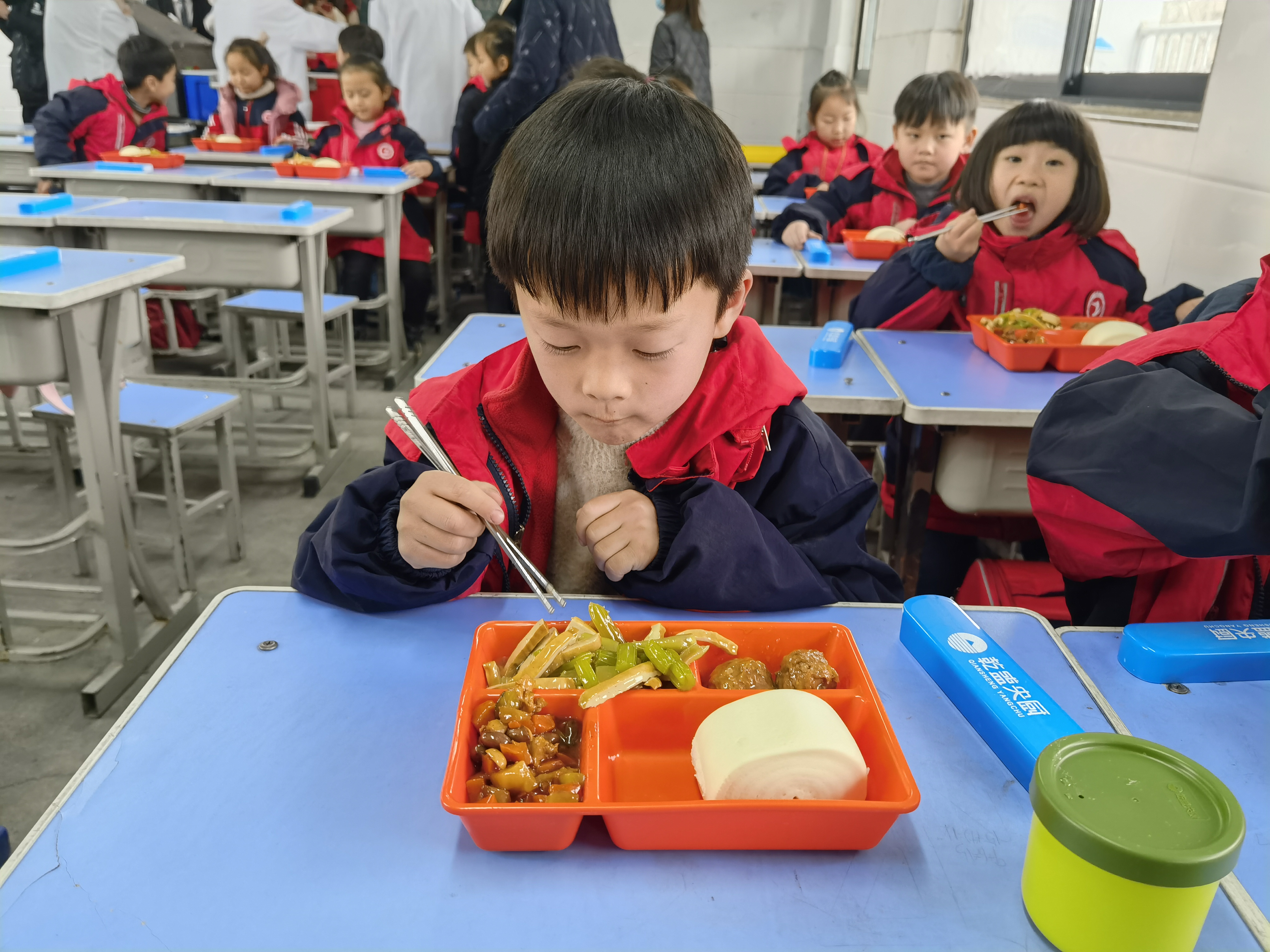 七一路二小校長邵在斌說:“中午配餐和延時服務(wù)是市委、市政府實實在在的惠民工程。為了做好這項工作,我們前期去鄭州參觀學習,回來按照文件精神去做。中午配餐解決很多問題,一是家長接學生難,輔導作業(yè)難的問題,我們中午配有語文老師,晚上配有數(shù)學老師給學生輔導作業(yè)。二是延緩了學校周邊交通壓力。三是能保證學生休息時間,為了配合延時服務(wù),我們的上課時間從8點調(diào)整到8點30分,但開門時間還是7點20分,方便上班早的家長送學生。本次送餐1200多份,每班用餐時兩名教師在崗,吃完飯后留一名老師輔導學生。今天我們?nèi)珕T監(jiān)督配餐,領(lǐng)導全部在崗,校長分包樓,中層領(lǐng)導分包層,責任到人,保證每個孩子用餐安全,讓每位家長都安心?!雹?