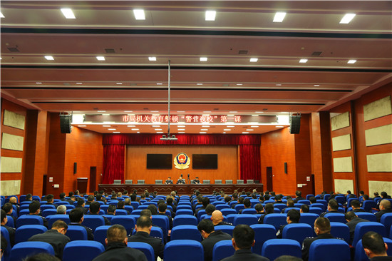 3月10日晚,“警營夜?!钡谝徽n正式開班開講。市公安局黨委委員、政治部主任郭冰與230名副科職以上民警一起參加學(xué)習(xí)。市公安局政治部黨支部副書記、三級高級警長韓鳳城主持第一課。
