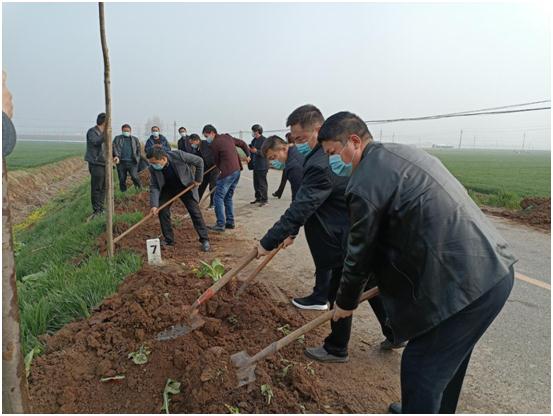 植樹現(xiàn)場,該鎮(zhèn)40余名黨員干部在鎮(zhèn)黨委副書記、鎮(zhèn)長劉健同志的帶領(lǐng)下扛著鐵鏟、提著水桶來到逍艾路兩旁開始植樹,栽樹、培土、澆水每一道工序大家都有條不紊地完成。
