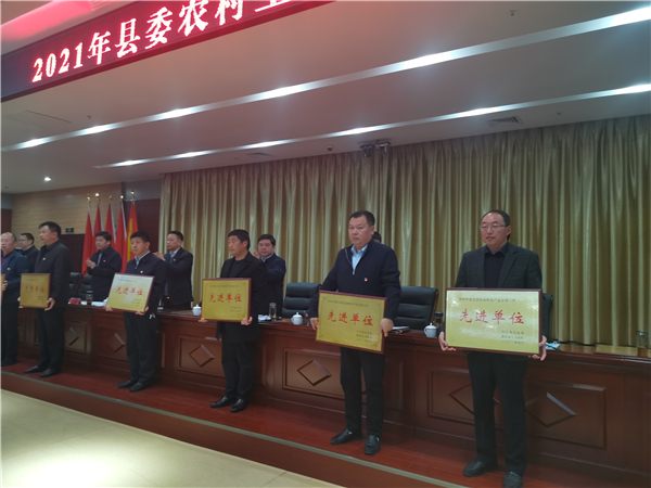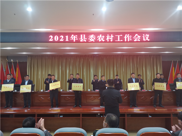 郭俊濤就貫徹落實(shí)會議精神及下一步農(nóng)村工作進(jìn)行具體安排部署??h委副書記許四軍宣讀了縣委、縣政府關(guān)于表揚(yáng)2020年度農(nóng)業(yè)農(nóng)村工作先進(jìn)單位、先進(jìn)個(gè)人的通報(bào)。會議還對受表彰的先進(jìn)單位代表進(jìn)行了頒獎(jiǎng)。