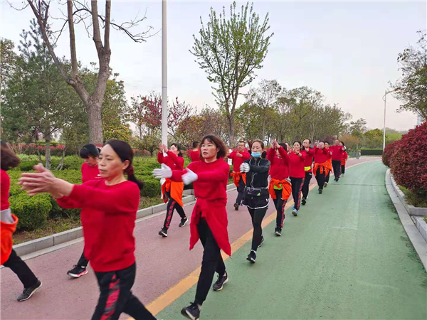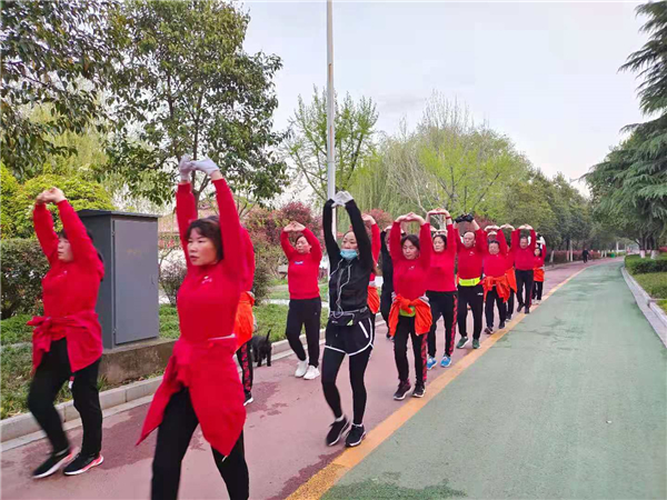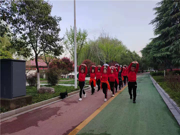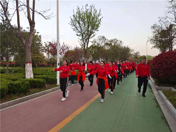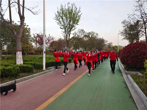 “一!二!三!四!”4月4日清晨,周口公園內(nèi)一支健步走愛好者身著紅色衛(wèi)衣,在潦亮的口號(hào)聲中,邁著嬌健的步伐,在鮮花綠葉中行進(jìn),撒下一路青春的氣息。②7
