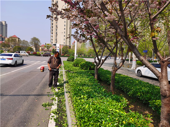 4月8日上午,周口市城鄉(xiāng)一體化示范區(qū)的園藝工人正在修剪周口大道綠化帶里的綠植。