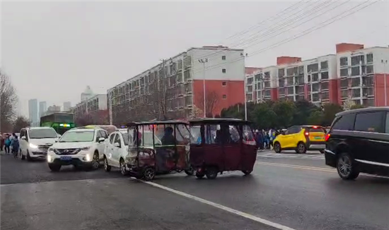 文昌路小學(xué)附近三輪車橫穿馬路造成交通堵塞