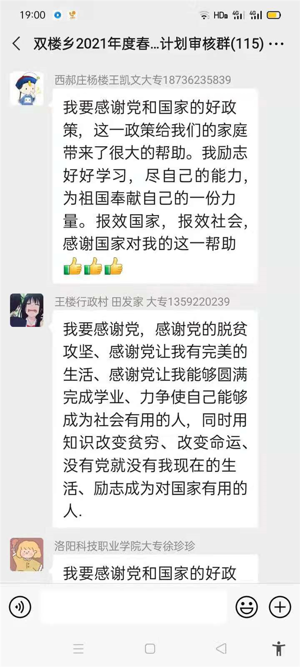 “感謝幫助過我家的所有幫扶人,沒有你們,就沒有我家今天的幸福生活,我們光榮脫貧了,作為貧困家庭中新成長勞動力,我一定珍惜這次來之不易的學習機會,好好學習技術(shù),畢業(yè)后回村成為一名技術(shù)帶頭人,來促進家鄉(xiāng)產(chǎn)業(yè)的發(fā)展?!编惓强h雙樓鄉(xiāng)孫莊村脫貧學生張素華在微信群里說。近幾天,鄲城縣雙樓鄉(xiāng)114人的大學生微信群里可熱鬧了,在鄉(xiāng)黨委政府的引導下,該鄉(xiāng)眾多脫貧后的大學生通過鄉(xiāng)里建起的微信群,紛紛圍繞“話脫貧、感黨恩、奮進新時代”這一主題交流思想,提振斗志。