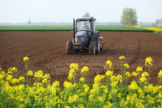 4月12日,商水縣袁老鄉(xiāng)羅堂村民在油菜花的掩映下忙著春耕。