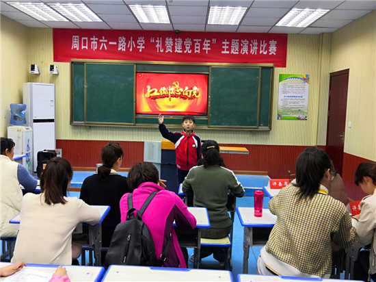 “中國共產(chǎn)黨是偉大的黨、崇高的黨、奮進的黨,百年歷程、百年輝煌;沒有共產(chǎn)黨就沒有新中國;我驕傲,我是中國人;我們要努力學習、奮發(fā)向上、為黨增光、為黨添彩……”周口市六一路小學舉辦“禮贊建黨百年”主題演講比賽,參賽選手回顧黨的光輝歷程、弘揚黨的豐功偉績,表達對中國共產(chǎn)黨的熱愛和贊頌,以各自獨特的見解給師生們進行了一次生動的理想信念教育。