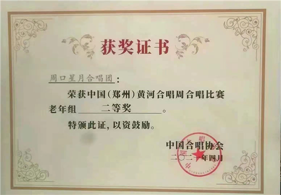 4月24日至27日,在河南鄭州舉辦的首屆“中國(guó)(鄭州)黃河合唱周”全國(guó)大賽中,周口星月合唱團(tuán)獲老年組二等獎(jiǎng)。這次由中國(guó)合唱協(xié)會(huì)牽頭舉辦的合唱大賽,全國(guó)共有72支隊(duì)伍參賽,劉楠、石孟嘵分別擔(dān)任合唱團(tuán)指揮和鋼琴伴奏。
