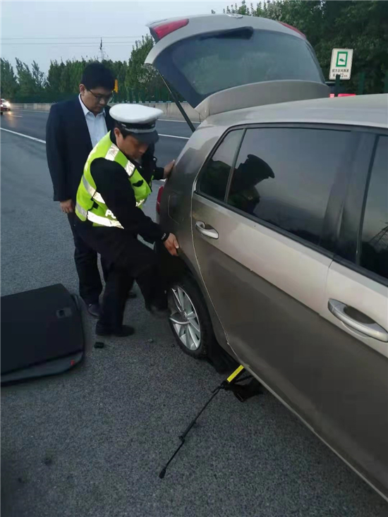 5月2日19時許,市公安局交通管理支隊高速二大隊項城中隊(以下簡稱高速二大隊項城中隊)民警由北往南方向巡邏途中,行駛到2081公里附近西半幅處,發(fā)現(xiàn)一輛轎車因車后輪爆胎,被迫停在應(yīng)急車道,民警隨即幫助該車主更換車載備胎,解決了司機的燃眉之急。