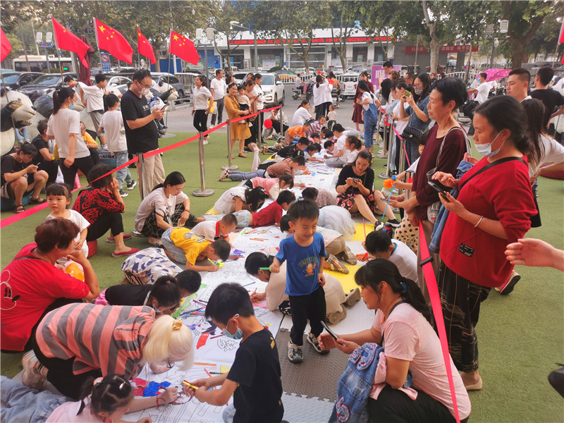 10月1日下午,在位于周口市中心城區(qū)七一路與中州大道交叉口的萬果園家庭茂商超前,近百名小朋友聚集在一起用手中的畫筆表達(dá)對祖國母親的祝福。