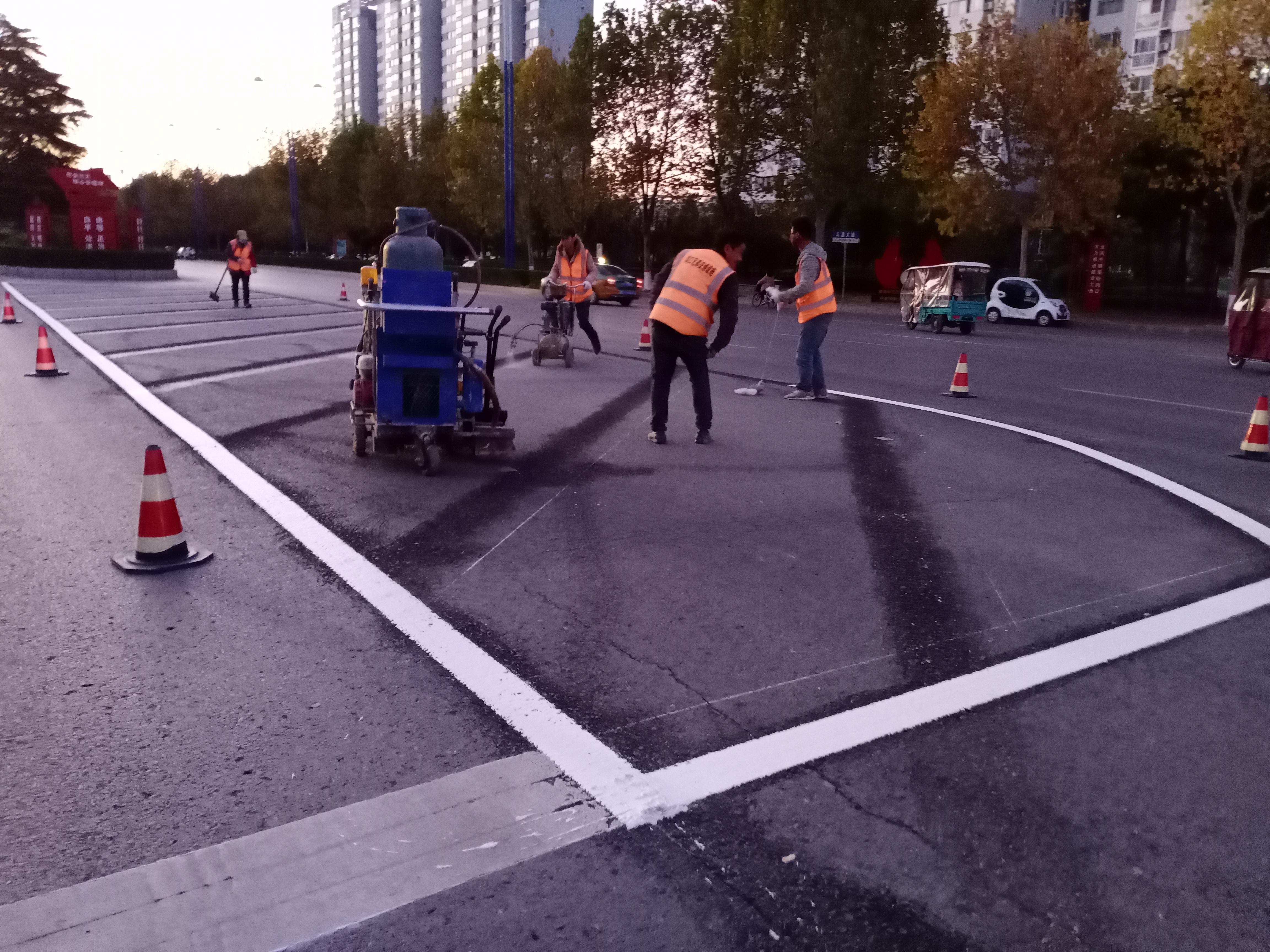 11月9日17時許,記者在周口市中心城區(qū)文昌大道與中原路交叉口看到,施工人員正在對交叉路口上的交通標志線進行施劃,規(guī)范車輛和行人通行秩序,保證交通安全暢通有序,方便群眾出行。③3記者 張洪濤 攝