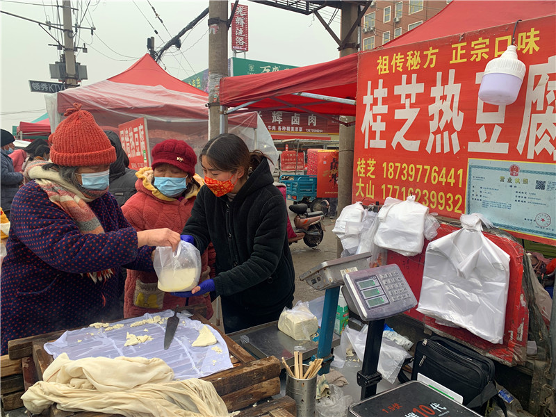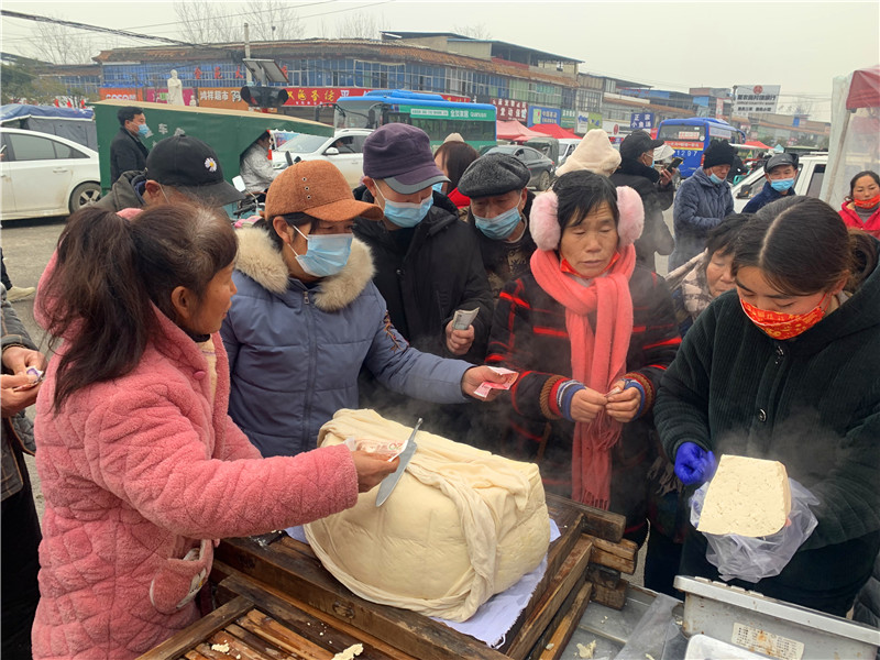 在固墻鎮(zhèn)的集市上,“桂枝熱豆腐”攤位前的顧客絡(luò)繹不絕?!敖o我來(lái)50塊錢(qián)的豆腐”“我要20斤,先給我切豆腐吧”“我要30斤,多少錢(qián)”……人群將豆腐攤里三層外三層圍了起來(lái),從人群外朝里看看不見(jiàn)豆腐,只看到豆腐攤里冒出來(lái)的團(tuán)團(tuán)熱氣?!暗攘税雮€(gè)小時(shí)了,剛才那一盒豆腐沒(méi)輪到我就賣(mài)完了,這才搶到手?!备浇拇迕駰畲鬆斈弥鴦傎I(mǎi)的豆腐高興地說(shuō)?!拔覐穆挂貋?lái)的,姐姐在里面擠著買(mǎi)豆腐,我在這兒等她呢?!?歲的張家瑞說(shuō),她每年放寒假都會(huì)和家人一起到固墻來(lái)探親,過(guò)年的時(shí)候逛逛集市,順便買(mǎi)些豆腐帶回鹿邑。