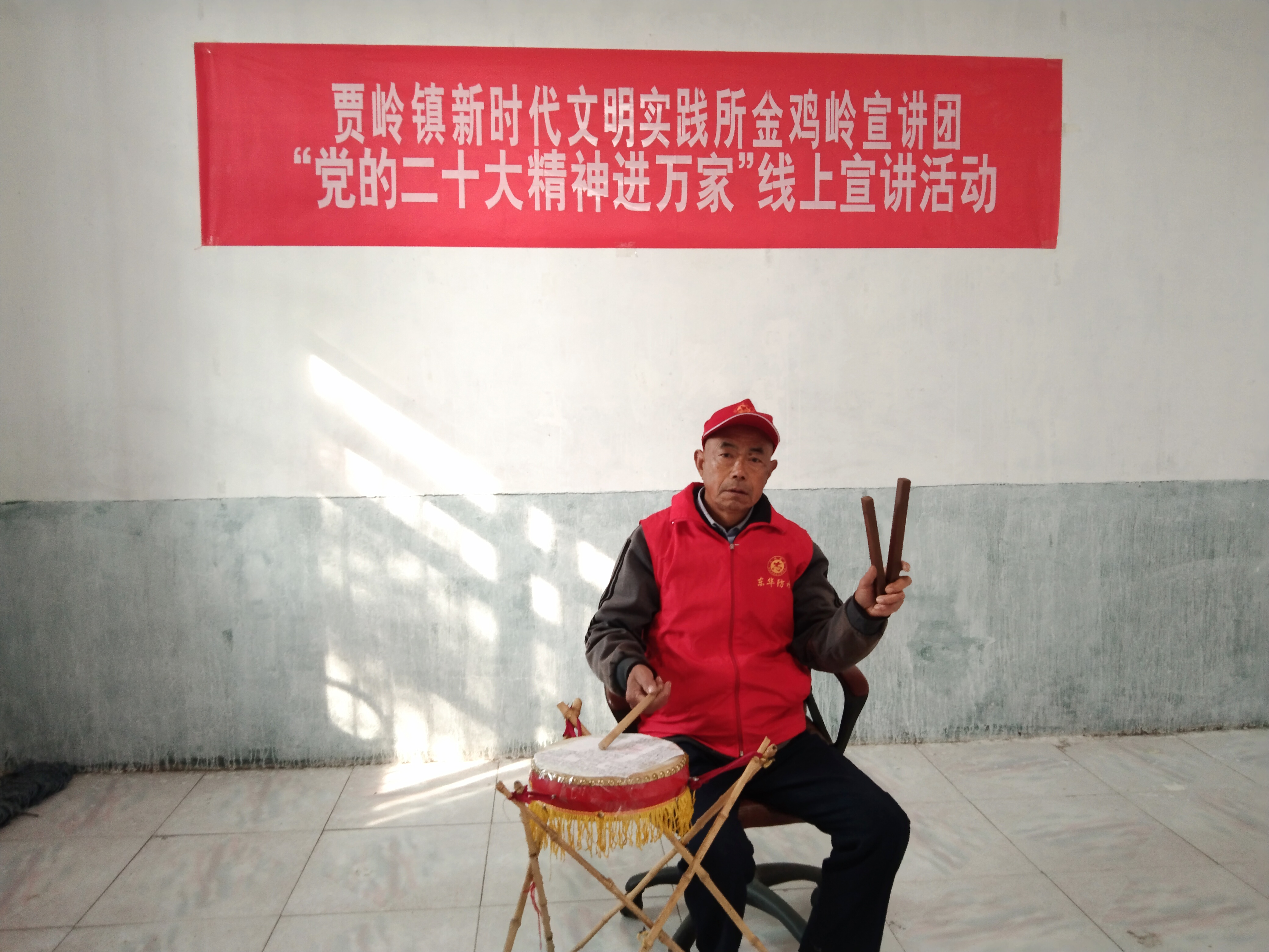 近日,項(xiàng)城市賈嶺鎮(zhèn)新時代文明實(shí)踐所金雞嶺宣講團(tuán)志愿者、七旬老人閆汝才閑暇就會坐在一張凳子上,一手敲鼓、一手夾板,配合唱腔、道白,利用非遺“大鼓書”藝術(shù)表演形式,通過抖音平臺在線上宣傳黨的二十大精神。