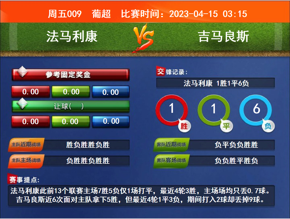 比賽時間:2023-04-15 03:15賽事提點:法馬利康此前13個聯(lián)賽主場7勝5負僅1場打平,最近4輪3勝,主場場均只丟0.7球。吉馬良斯近6次面對主隊拿下5勝,但最近4輪1平3負,期間打入2球卻丟掉9球。