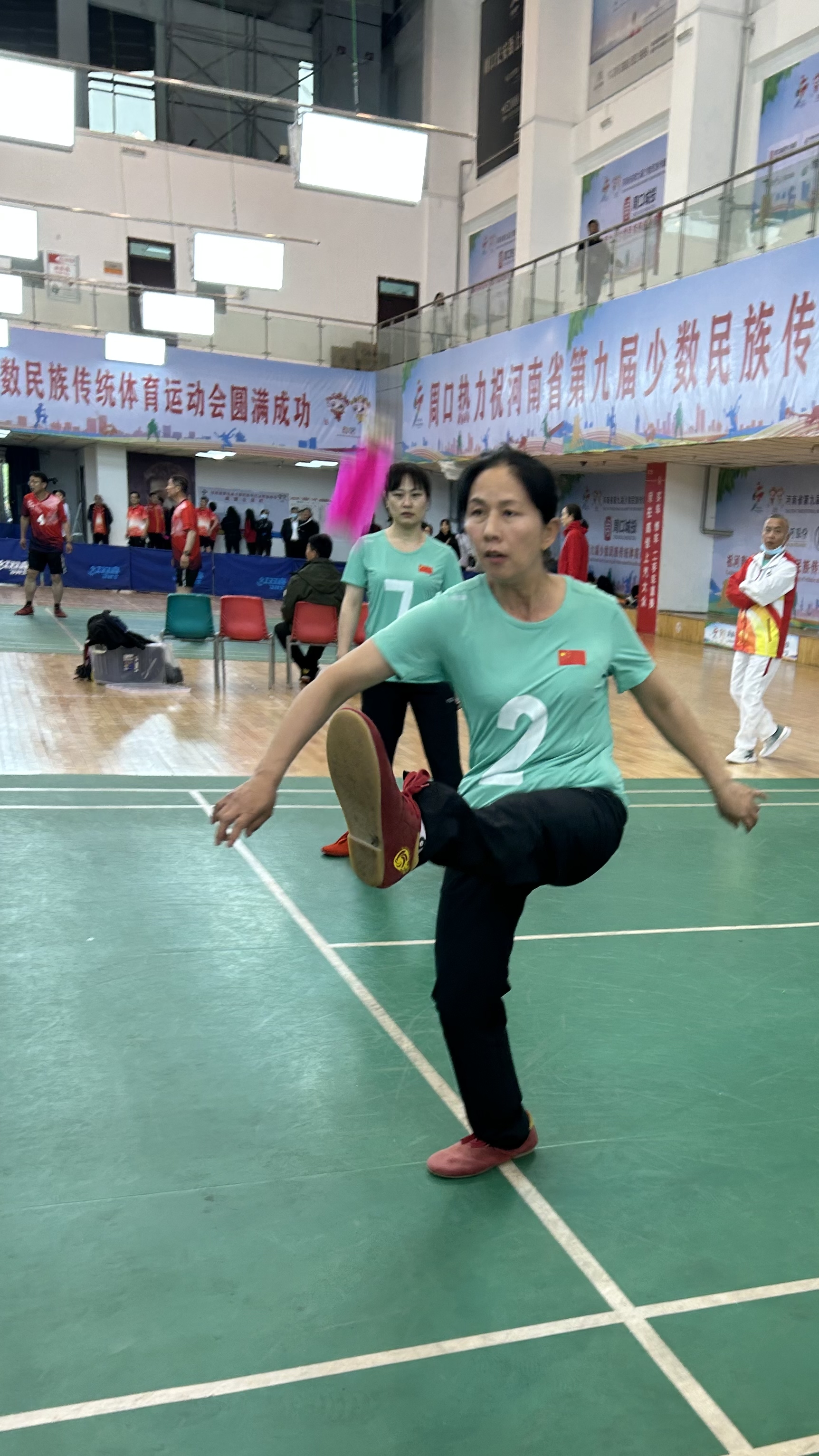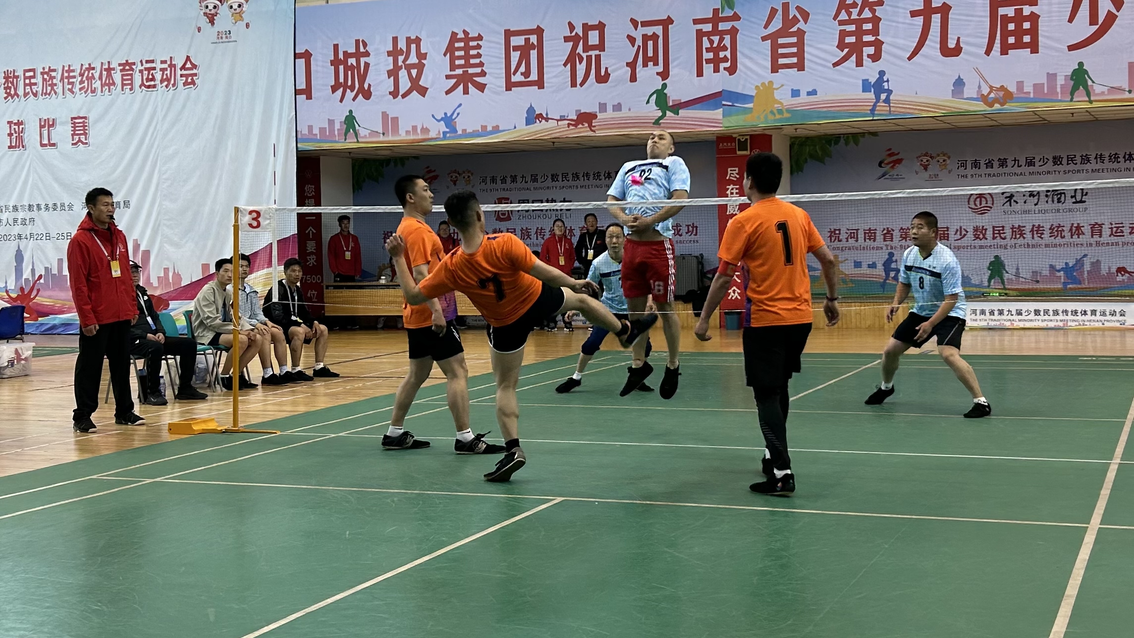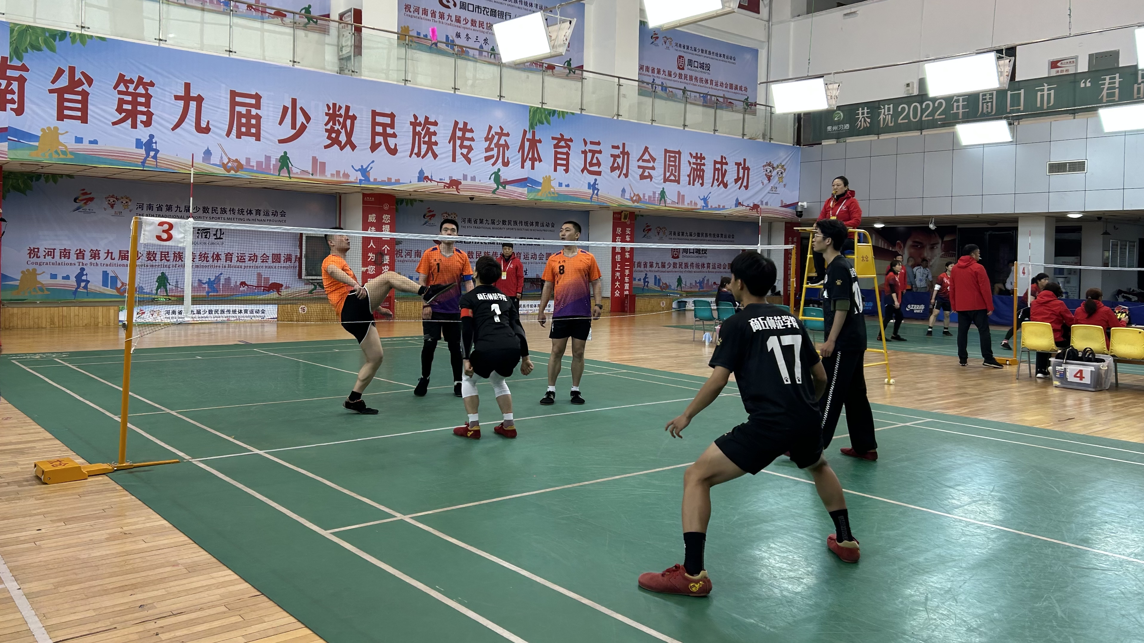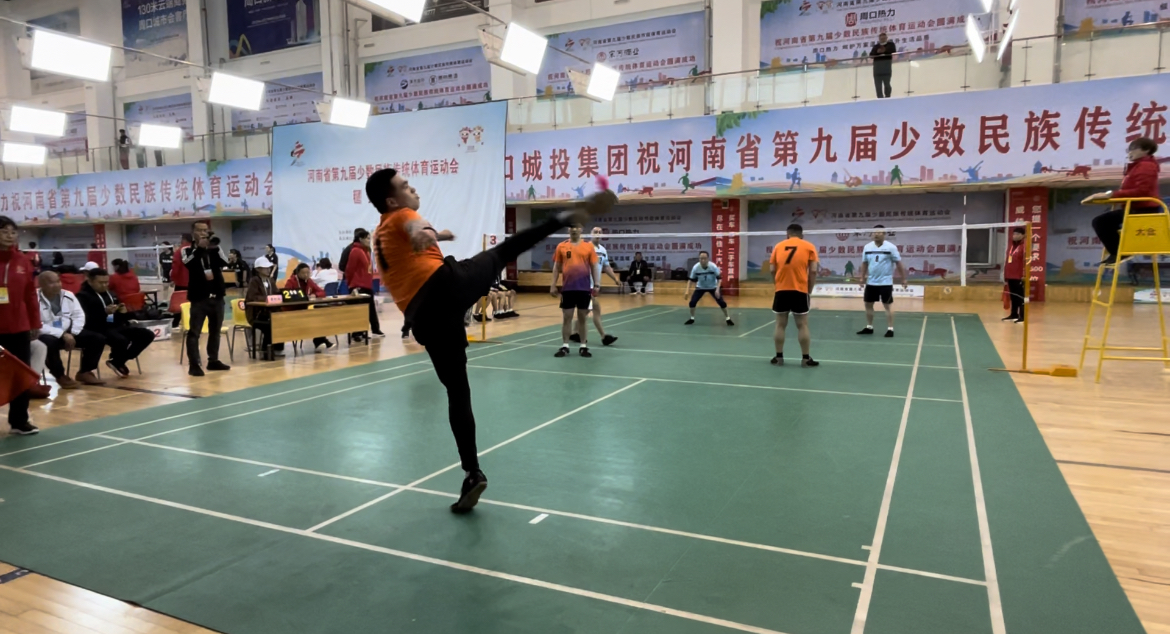 在首日頗具看點的男子三人毽(鄭州隊VS焦作隊)競賽中,作為“種子隊”,鄭州隊在接起對方發(fā)球后,利用“三人接發(fā)球”進攻陣形,運用強攻、快攻、兩次攻及多點攻等戰(zhàn)術打法,突破對方攔網;焦作隊頂住壓力、不甘示弱,只見隊員們配合默契,將毽球用前胸輕松一頂、落至膝蓋,再用一記踩踏攻球,攻至對方區(qū)域。雙方不斷拉鋸,最終,鄭州隊獲勝累積一分。值得一提的是,比賽過半時,鄭州隊92號隊員在撲身攔網時,因幅度較大失去重心,朝欄網壓去,一瞬間,距離最近的焦作隊7號隊員毫不猶豫沖上前扶住,雙方隊員紛紛上前關心查看。一時間,一股團結、和諧、友愛之風席卷整個比賽現場。