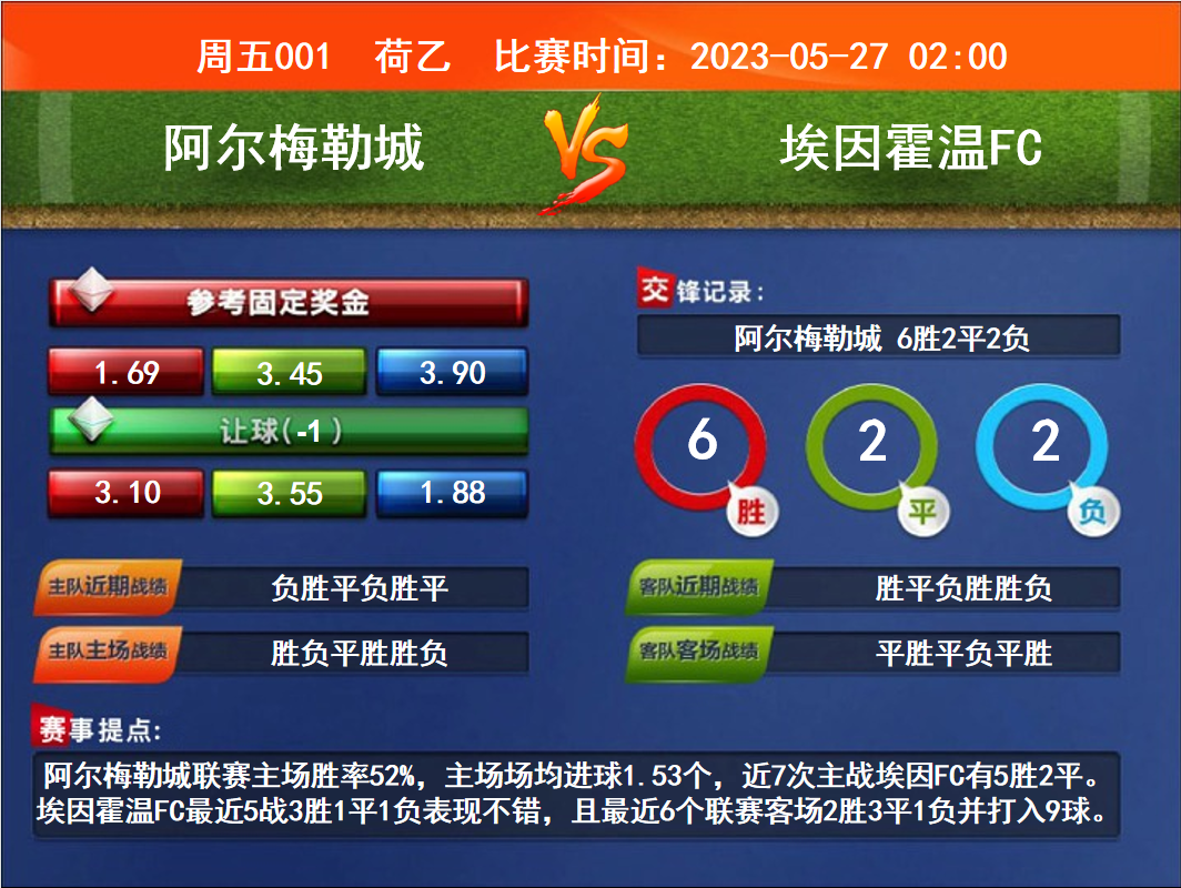 比賽時(shí)間:2023-05-27 02:00賽事提點(diǎn):阿爾梅勒城聯(lián)賽主場(chǎng)勝率52%,主場(chǎng)場(chǎng)均進(jìn)球1.53個(gè),近7次主戰(zhàn)埃因FC有5勝2平。埃因霍溫FC最近5戰(zhàn)3勝1平1負(fù)表現(xiàn)不錯(cuò),且最近6個(gè)聯(lián)賽客場(chǎng)2勝3平1負(fù)并打入9球。