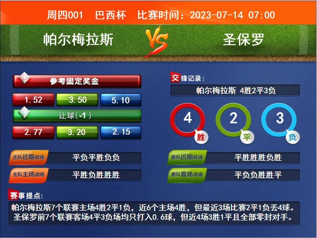 比賽時(shí)間:2023-07-14 07:00賽事提點(diǎn):帕爾梅拉斯7個(gè)聯(lián)賽主場(chǎng)4勝2平1負(fù),近6個(gè)主場(chǎng)4勝,但最近3場(chǎng)比賽2平1負(fù)丟4球。圣保羅前7個(gè)聯(lián)賽客場(chǎng)4平3負(fù)場(chǎng)均只打入0.6球,但近4場(chǎng)3勝1平且全部零封對(duì)手。