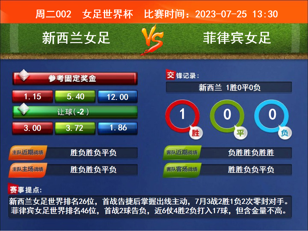 比賽時(shí)間:2023-07-25 13:30賽事提點(diǎn):新西蘭女足世界排名26位,首戰(zhàn)告捷后掌握出線(xiàn)主動(dòng),7月3戰(zhàn)2勝1負(fù)2次零封對(duì)手。菲律賓女足世界排名46位,首戰(zhàn)2球告負(fù),近6仗4勝2負(fù)打入17球,但含金量不高。