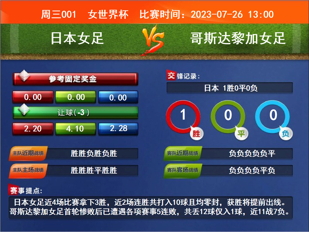 比賽時間:2023-07-26 13:00賽事提點:日本女足近4場比賽拿下3勝,近2場連勝共打入10球且均零封,獲勝將提前出線。哥斯達黎加女足首輪慘敗后已遭遇各項賽事5連敗,共丟12球僅入1球,近11戰(zhàn)7負。