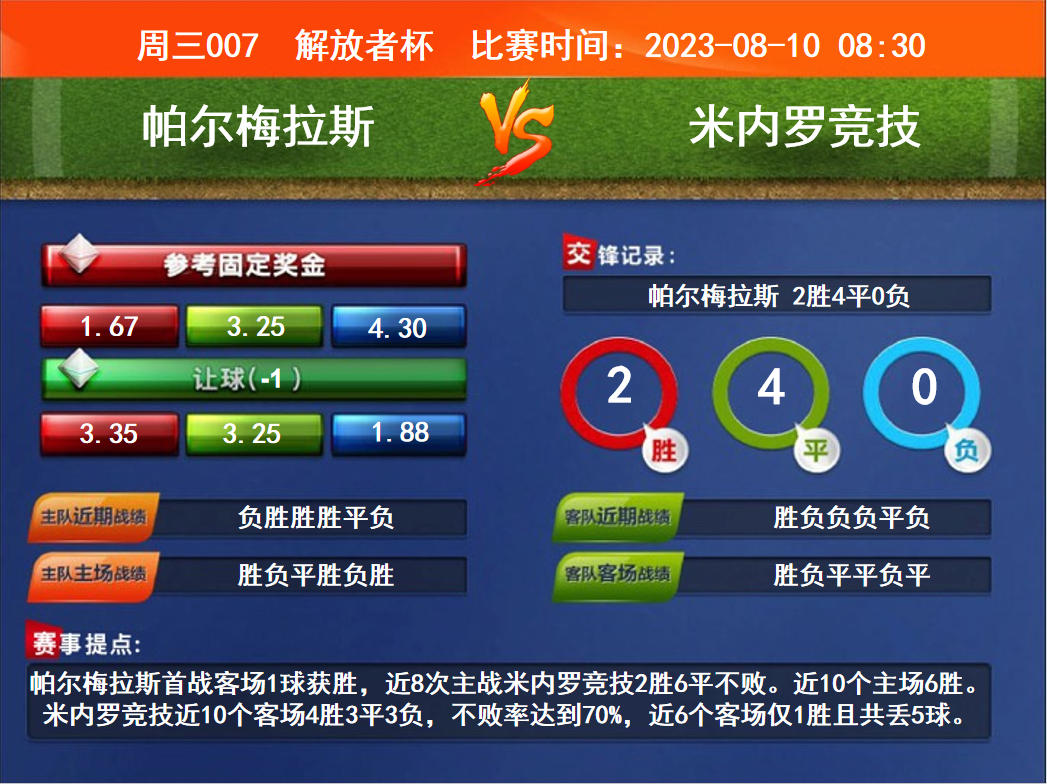 比賽時間:2023-08-10 08:30賽事提點(diǎn):帕爾梅拉斯首戰(zhàn)客場1球獲勝,近8次主戰(zhàn)米內(nèi)羅競技2勝6平不敗。近10個主場6勝。米內(nèi)羅競技近10個客場4勝3平3負(fù),不敗率達(dá)到70%,近6個客場僅1勝且共丟5球。
