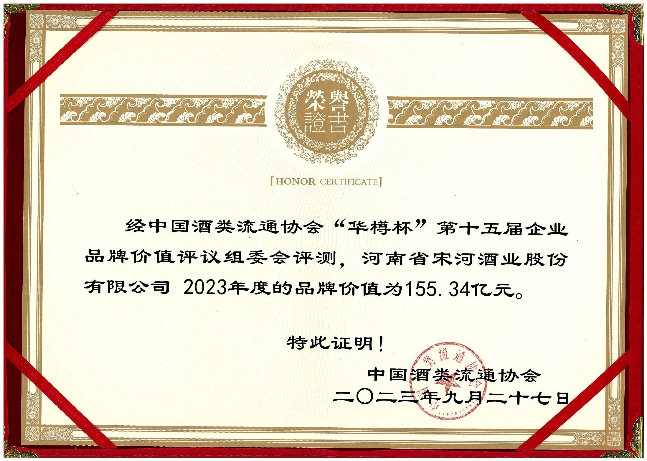 9月27日,第十五屆中國(guó)酒類企業(yè)品牌價(jià)值發(fā)布會(huì)在北京國(guó)家會(huì)議中心隆重舉辦。經(jīng)企業(yè)品牌價(jià)值評(píng)議委員會(huì)評(píng)測(cè),宋河酒業(yè)2023年度的品牌價(jià)值為155.34億元。作為河南唯一的濃香型中國(guó)名酒品牌,宋河酒業(yè)同時(shí)在會(huì)上斬獲多項(xiàng)殊榮。