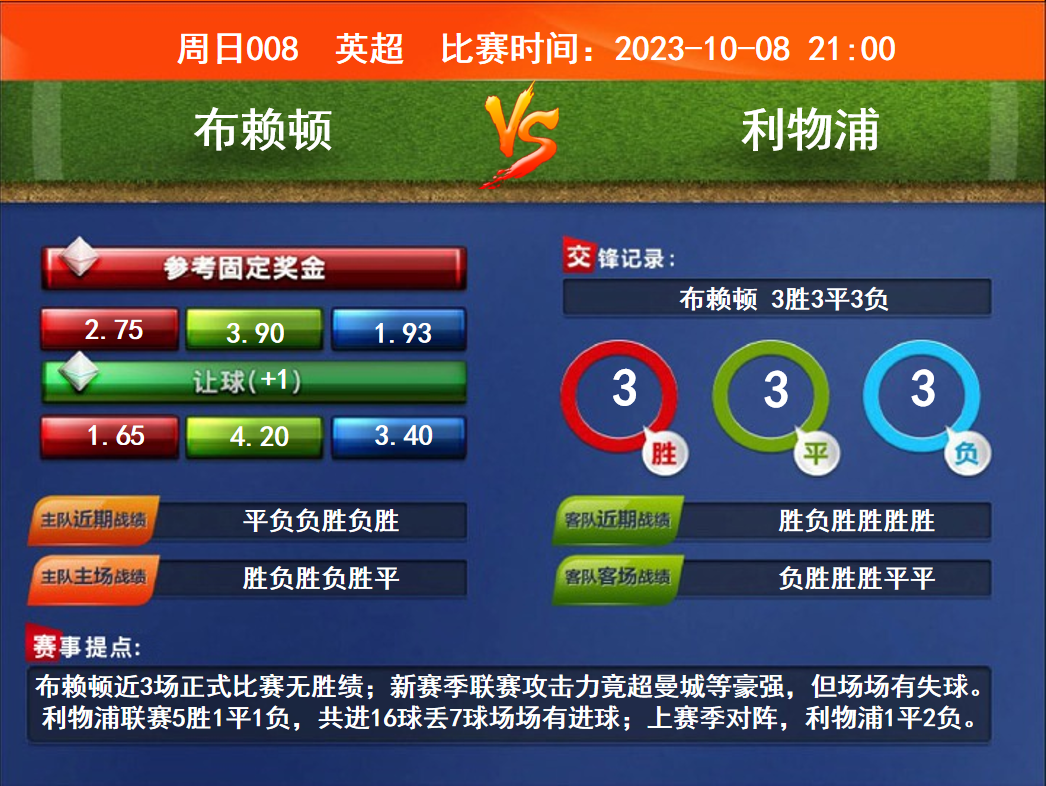 比賽時間:2023-10-08 21:00賽事提點:布賴頓近3場正式比賽無勝績;新賽季聯(lián)賽攻擊力竟超曼城等豪強(qiáng),但場場有失球。利物浦聯(lián)賽5勝1平1負(fù),共進(jìn)16球丟7球場場有進(jìn)球;上賽季對陣,利物浦1平2負(fù)。