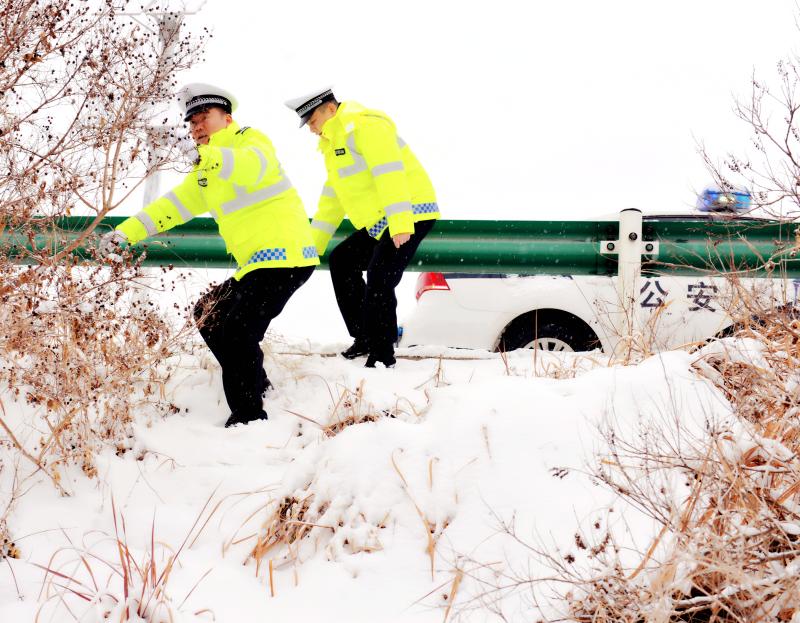 “你們是一道美麗的雪‘警’!”警車通過、兩車并行時,車上司乘人員搖開車窗玻璃向民警伸出大拇指點贊,民警敬禮并鳴笛致謝。②2