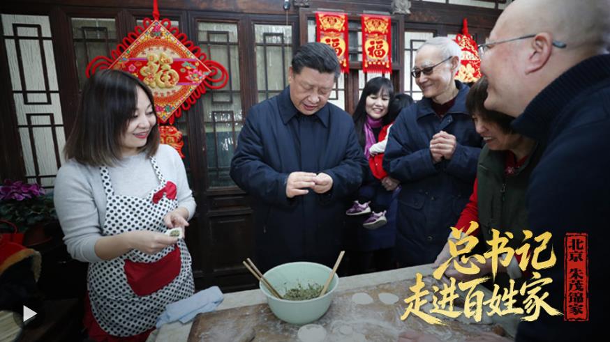 2019年春節(jié)前夕,習(xí)近平總書(shū)記走進(jìn)北京市東城區(qū)草廠四條胡同。在居民朱茂錦家里,總書(shū)記與他們一家邊包水餃邊聊家常??倳?shū)記笑著說(shuō):“我家里也愛(ài)包茴香餡的。多年來(lái)因工作關(guān)系我沒(méi)包過(guò)餃子了,你們看,越包越好。我們的生活也是這樣,越過(guò)越好!”