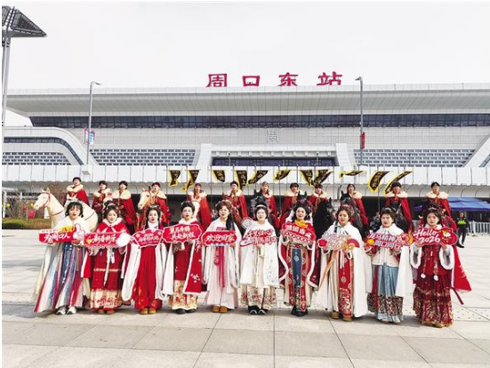 2月9日,身著漢服的舞蹈演員在高鐵周口東站廣場上帶來靈動的快閃表演,傳遞周口文化韻味。