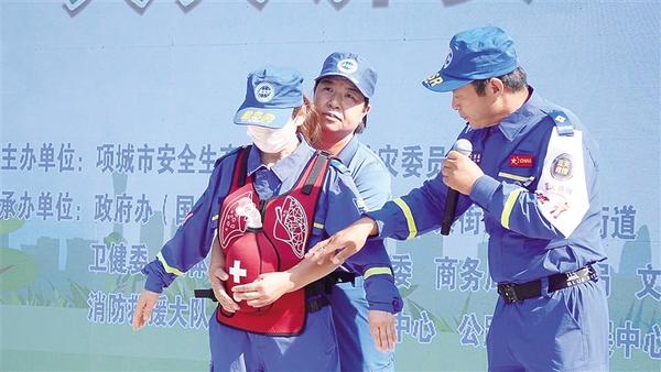6月16日,項城市舉行“安全宣傳咨詢日”活動?;顒釉O置警示教育片展播、應急技能演示、救援裝備展示、安全咨詢等環(huán)節(jié)。圖為項城應急藍天救援隊3名隊員演示海姆立克急救法操作流程。
