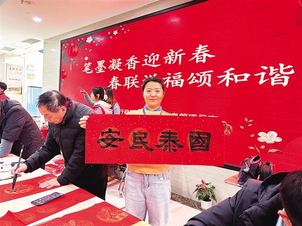 1月20日,扶溝縣政務(wù)服務(wù)中心一名工作人員展示剛收到的手寫春聯(lián)。連日來,我市數(shù)千余名書法家、書法愛好者為市民寫春聯(lián)、送“?!弊?,送上美好的祝福。