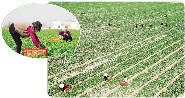 近年來(lái),我市積極推廣“合作社+農(nóng)戶”“家庭農(nóng)場(chǎng)+農(nóng)戶”經(jīng)營(yíng)模式,鼓勵(lì)農(nóng)民通過(guò)土地流轉(zhuǎn)將分散耕地整合起來(lái),實(shí)現(xiàn)集中化、規(guī)模化經(jīng)營(yíng),全力提高土地利用效率,為鄉(xiāng)村振興注入強(qiáng)勁動(dòng)力。圖為4月11日,在淮陽(yáng)區(qū)王店街道范莊行政村的農(nóng)田里,村民正采收蔬菜。