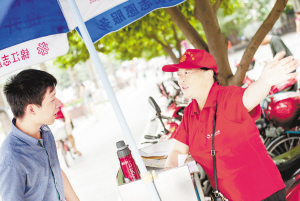 8月28日,55歲的志愿者徐麗華(右)在四川成都人民南路二段與濱江路交叉口的志愿者服務站為人指路。 炎炎夏日,許多志愿者活躍在四川成都的街頭巷尾,他們耐著高溫濕熱的天氣,為市民游客答疑解惑、提供力所能及的幫助。這些志愿者成了蓉城夏日街頭的一道靚麗風景。 新華社發(fā)
