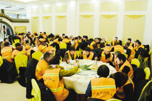 本報(bào)訊 (記者 徐啟峰 通訊員 劉巍 文/圖) 2月17日,農(nóng)歷臘月二十九上午,愛(ài)心人士韓平為川匯區(qū)環(huán)衛(wèi)工人送去棉大衣,并邀請(qǐng)環(huán)衛(wèi)工人共進(jìn)午餐(如圖)。