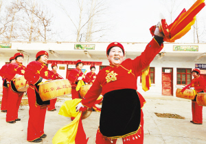 ④扶溝縣江村鎮(zhèn)江南盤鼓隊正在村室緊張排演節(jié)目。春節(jié)期間,她們走上街頭,為當?shù)厝罕娝蜕衔幕蟛汀?nbsp; (記者 王 映 攝)