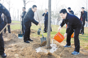 3月12日,皇甫立新等在植樹點(diǎn)植樹。當(dāng)日,沈丘縣四個(gè)班子領(lǐng)導(dǎo)來到縣城東環(huán)路綠化帶植樹點(diǎn),與當(dāng)?shù)厝罕娨黄饟]鍬鏟土,參加義務(wù)植樹活動。(記者 韋偉 通訊員 艾長青)