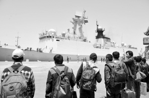 在亞丁灣、索馬里海域的中國海軍護航艦艇編隊,接到上級命令后,迅速駛向也門緊急???。劉永選說,軍艦從申請到靠岸一般要一個月時間,而這次我們只用了4天。