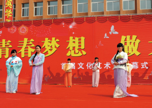 該校把特色教育作為發(fā)展的名片,推出“一班一品一特色”活動(dòng)。學(xué)校建立以班級(jí)為單位的社團(tuán)組織,并細(xì)分為體育類、舞蹈類、樂器類、美術(shù)類四大類別,共70個(gè)社團(tuán)。比如:美工社團(tuán)制作漢服進(jìn)行表演,每一次都讓在場的觀眾潸然淚下,為自己是一個(gè)漢唐中華子孫而驕傲,為著漢唐服裝而自豪。學(xué)校出版了《求真大課堂》《走在成長的路上》《花季無悔》《中學(xué)生科技創(chuàng)作》《班主任德育思想錄》《國學(xué)之蘊(yùn)》《家和萬事興》《共創(chuàng)一個(gè)夢 和韻文昌之家校共建》《“文昌杯”文明我先行 共筑一個(gè)夢》主題征文作文選等校本教材。為豐富校園文化生活,學(xué)校邀請中國政法大學(xué)的霍登科,歷史文化學(xué)者王少清,青少年心理教育專家張海選、萬禮彬,周口市中心醫(yī)院婦產(chǎn)科主任楊莉,河南國學(xué)院的施柳貞、王福琪、楊茹梅以及國內(nèi)外優(yōu)秀大學(xué)生對學(xué)生進(jìn)行國學(xué)誦讀和教育、演講比賽、法制教育、夢想目標(biāo)教育、青春期心理和生理教育等活動(dòng)。在該校首屆“做大成教育 展青春夢想”文化藝術(shù)節(jié)活動(dòng)中,有一項(xiàng)活動(dòng)叫珍藏十年“心愿瓶”,當(dāng)滿載學(xué)生夢想的心愿瓶準(zhǔn)備珍藏時(shí),晴天出現(xiàn)了彩虹,讓在場的領(lǐng)導(dǎo)、家長、學(xué)生很驚嘆,說文昌中學(xué)的學(xué)生目標(biāo)遠(yuǎn)大,定有大才出現(xiàn)。這些有意義的活動(dòng)對廣大未成年人的身心健康起到了很好的促進(jìn)作用。
