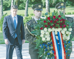 ?、?月9日,在克羅地亞首都薩格勒布,克總理米拉諾維奇(左)在紀(jì)念反法西斯戰(zhàn)爭勝利70周年的活動中向人民英雄紀(jì)念碑敬獻花圈。新華社發(fā)