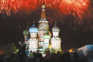 ?、?月9日,禮花在俄羅斯首都莫斯科紅場上空綻放。