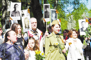 ③5月9日,在拉脫維亞首都里加,人們手持在衛(wèi)國戰(zhàn)爭中犧牲的親人照片參加紀(jì)念衛(wèi)國戰(zhàn)爭勝利70周年活動。
