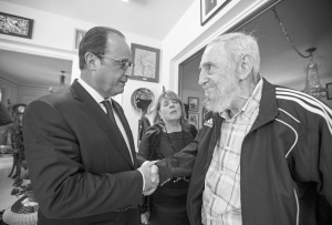 菲德爾·卡斯特羅會見奧朗德 5月11日,在古巴首都哈瓦那,古巴前領(lǐng)導(dǎo)人菲德爾·卡斯特羅(右)會見到訪的法國總統(tǒng)奧朗德(左)。當(dāng)日,法國總統(tǒng)奧朗德在古巴哈瓦那大學(xué)演講。他在演講中呼吁美國解除對古巴的經(jīng)濟(jì)封鎖。奧朗德于10日晚抵達(dá)哈瓦那,開始對古巴進(jìn)行為期3天的訪問,他是冷戰(zhàn)結(jié)束后首位訪問古巴的法國國家元首。