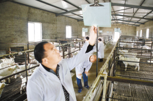 孫振偉原是當(dāng)?shù)刂那嗄昶髽I(yè)家,2008年初被西關(guān)村居民高票選舉為村黨支部書記,憑著對家鄉(xiāng)的強烈責(zé)任感和保護槐山羊特色品種的使命感,孫振偉帶領(lǐng)西關(guān)村立足本村作為槐山羊傳統(tǒng)養(yǎng)殖區(qū)的優(yōu)勢,于2010年成立沈丘縣槐山羊養(yǎng)殖發(fā)展有限公司,在省畜牧展交易會上,與鄭州鄭源公司合作,共同簽約了投資6000萬元建設(shè)槐山羊原種保護、繁育、深加工項目。同時與華中農(nóng)大建立技術(shù)合作關(guān)系,投資800萬元建成“槐山羊原種保護和繁育中心”,規(guī)劃設(shè)計了化驗室、消毒室、提純復(fù)壯室、品種基因室等配套規(guī)范設(shè)施,不僅為國家級優(yōu)良品種槐山羊的保種提純工作提供了科研平臺和寶貴數(shù)據(jù)庫,“槐山羊提純復(fù)壯良種繁育技術(shù)研究與應(yīng)用”成果還獲得2013年度周口市科技進步一等獎。經(jīng)過提純復(fù)壯,目前中心存欄特征明顯的槐山羊母羊860只、種公羊36只,在此基礎(chǔ)上,計劃建成占地100畝的槐山羊養(yǎng)殖小區(qū),槐山羊板皮、肉制品等深加工項目都已經(jīng)開始實施。 “這些是經(jīng)過第五輪提純復(fù)壯繁育的槐山羊,目前可以說是最純種的槐山羊了?!睂O振偉指著一批剛出生的小羊向我們介紹。