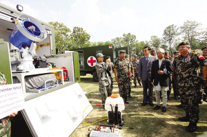 5月25日,在尼泊爾首都加德滿(mǎn)都,尼泊爾軍隊(duì)總參謀長(zhǎng)拉納(前右一)在中國(guó)駐尼泊爾大使吳春太(前右三)的陪同下參觀中國(guó)捐贈(zèng)的野戰(zhàn)醫(yī)院設(shè)備。