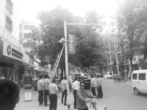 文明路亂裝亂掛的燈箱、條幅廣告嚴(yán)重影響城市形象,被川匯區(qū)城管人員依法強(qiáng)制拆除。