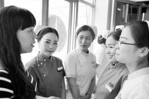 參加技能比賽的醫(yī)務(wù)工作者正在交流比賽心得。
