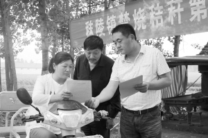 項(xiàng)城市秣陵鎮(zhèn)積極做好夏季秸稈禁燒工作,實(shí)行班子成員包片、機(jī)關(guān)干部包村、村組干部包戶責(zé)任制,全力構(gòu)筑了秸稈禁燒“防火墻”。圖為6月8日該鎮(zhèn)干部在李閣村向過往群眾發(fā)放禁燒宣傳單。(張永久 攝)