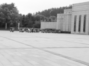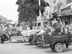 圖① 周口師范學(xué)院大門前又見排成一行的“紅頂三輪車”在從事非法營運(yùn),沒人進(jìn)行管理。