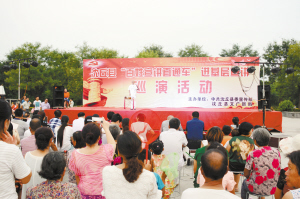 7月13日,沈丘縣“百姓宣講直通車(chē)”進(jìn)基層宣講首場(chǎng)演出在該縣中華槐園千字文廣場(chǎng)舉行,舞蹈、戲曲、小品、大鼓書(shū)等多樣化的藝術(shù)形式,為前來(lái)游玩休閑的市民獻(xiàn)上了一道豐厚的精神大餐,讓大家在娛樂(lè)之余,對(duì)黨的新理論新政策有了更多的了解。圖為節(jié)目演出現(xiàn)場(chǎng)。(邵永成 攝)